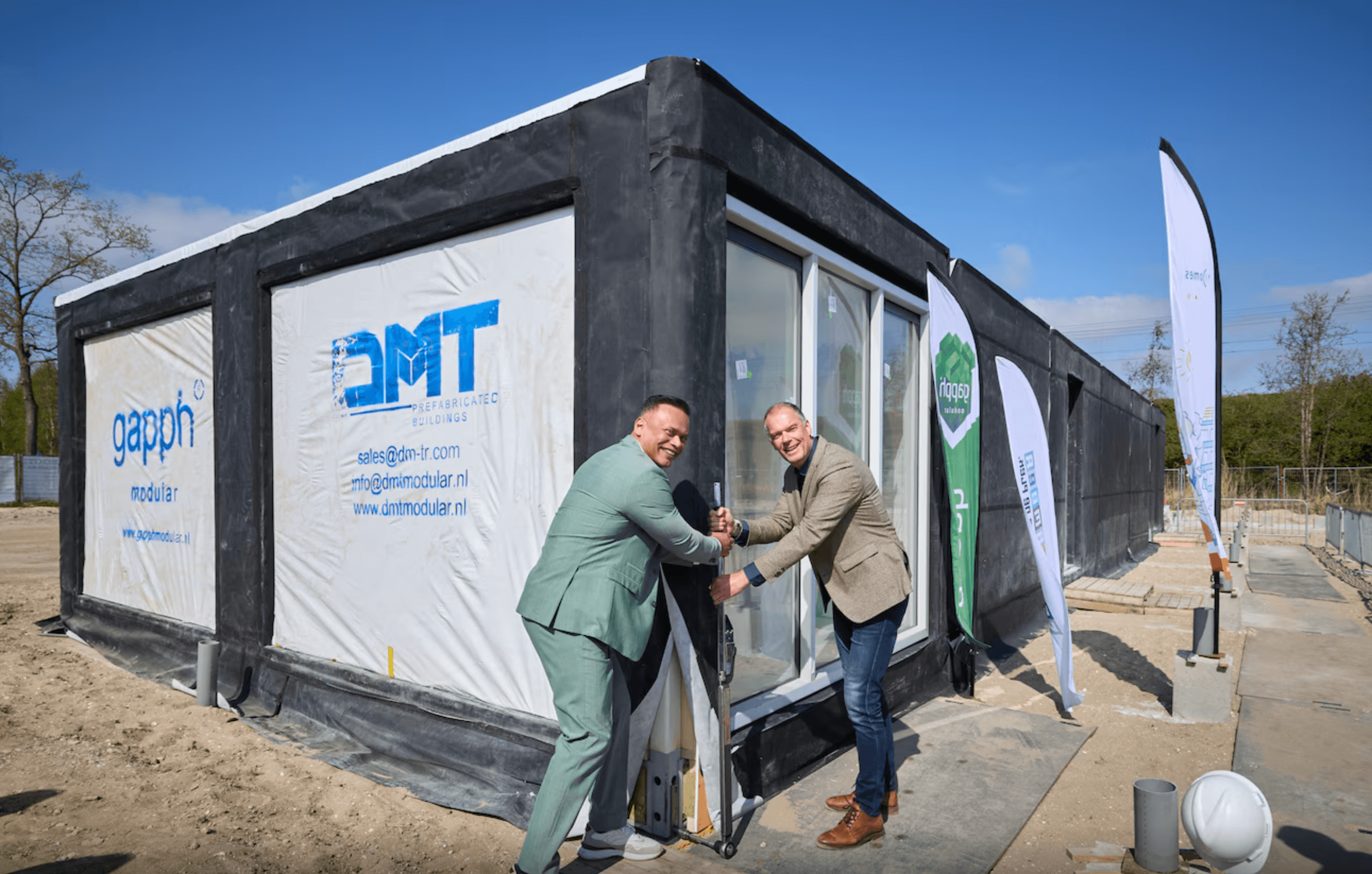 De bouw van 81 flexwoningen aan de Ruimtebaan in Zoetermeer is officieel van start. Vertegenwoordigers van woningcorporatie Vidomes, de gemeente en bouwpartner Gapph Modular hebben de eerste modules vastgezet aan de fundering. De eerste bewoners kunnen deze zomer intrekken.
