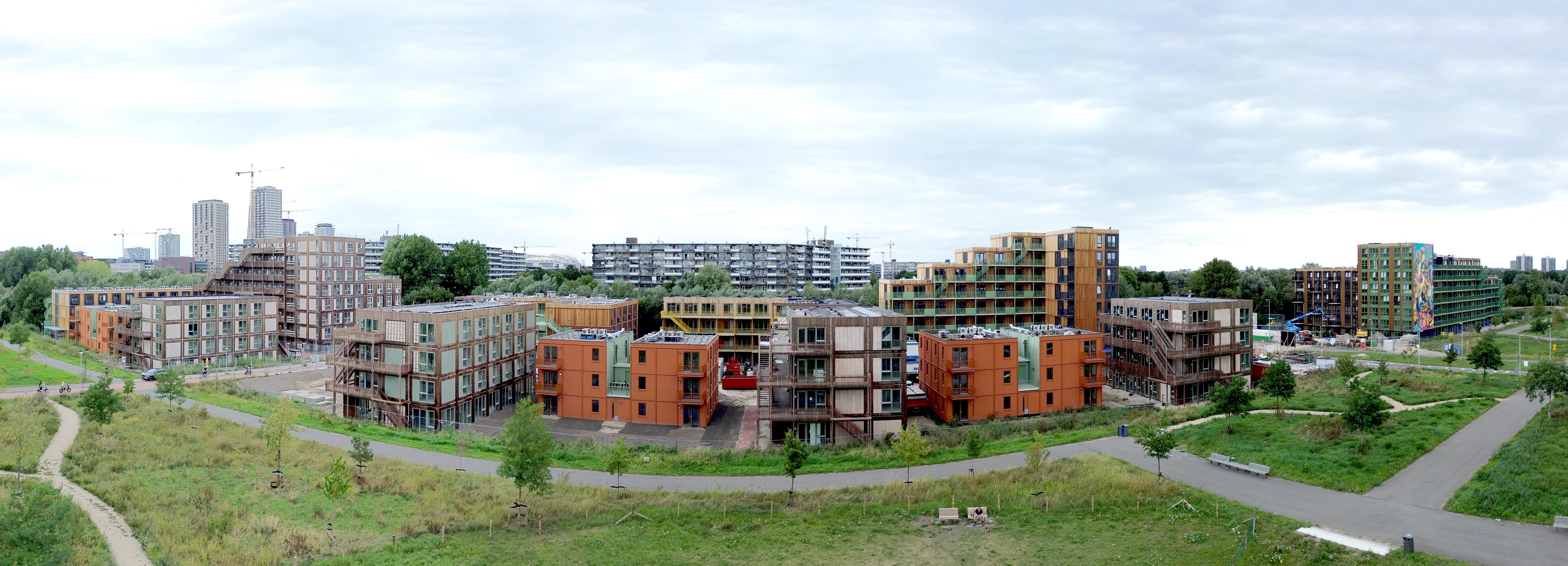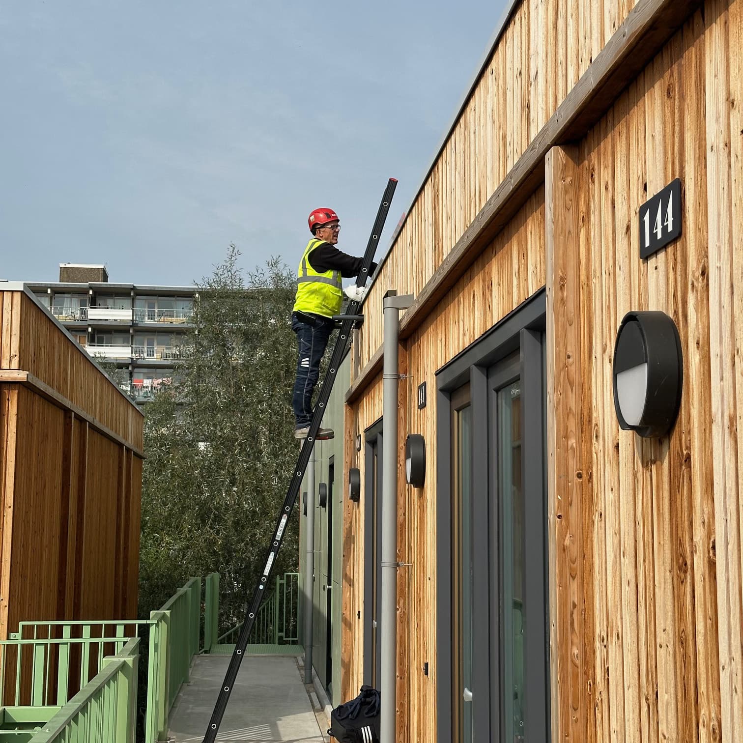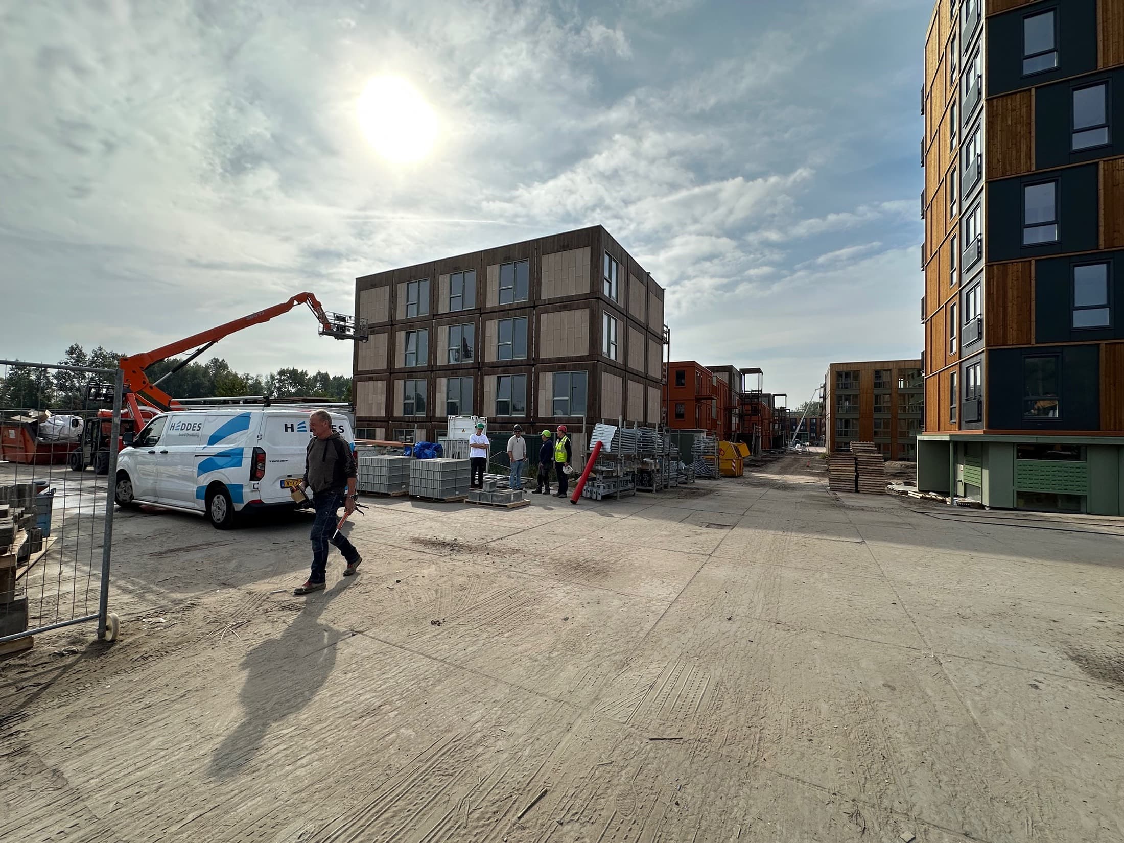 We staan stil bij een van de blokken die bijna opgeleverd zijn. De gevels zijn van hout en mooi afgewerkt. Er is buiten zelfs een zitbankje voor het raam . Het ziet er nu al gezellig uit. Binnen ruikt het nog naar nieuwbouw. “Deze woningen komen kant-en-klaar uit de fabriek,” vertelt Sieval. “Het zijn modulaire modulaire units. Badkamer, keuken, installaties, alles zit er al in. Hier op locatie koppelen we ze aan elkaar en werken we de buitenkant af.”